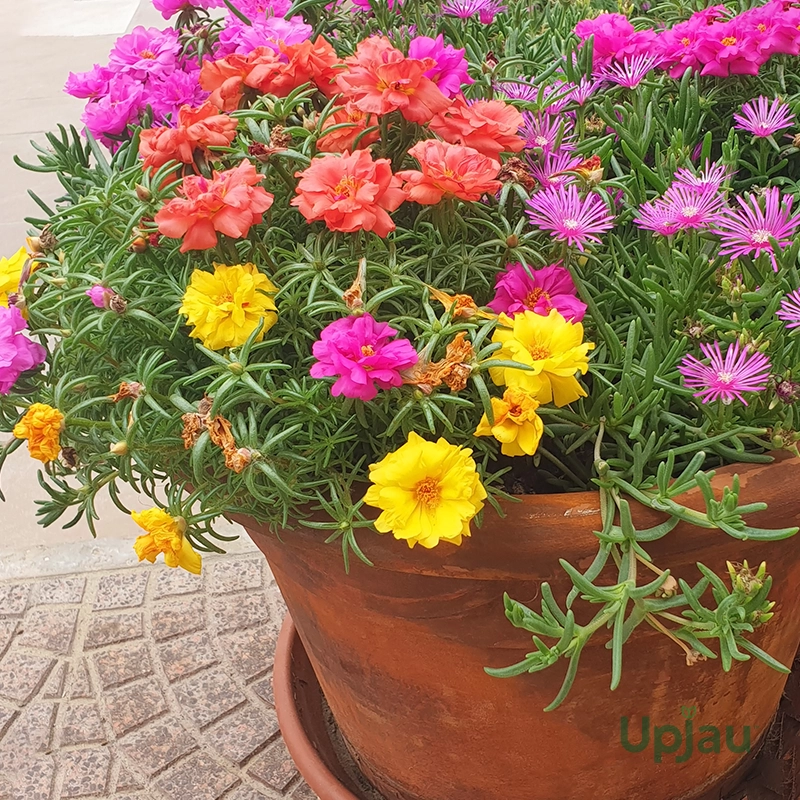Portulaca Happy Hour Mix Seeds (Hybrid), available at Upjau.in, offer a delightful mix of vibrant-colored flowers in shades of pink, orange, yellow, and white. These hybrid seeds produce low-growing, drought-tolerant plants that thrive in sunny locations, making them ideal for rock gardens, borders, and containers.